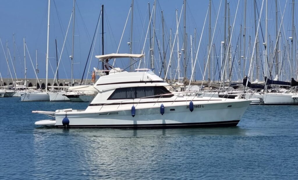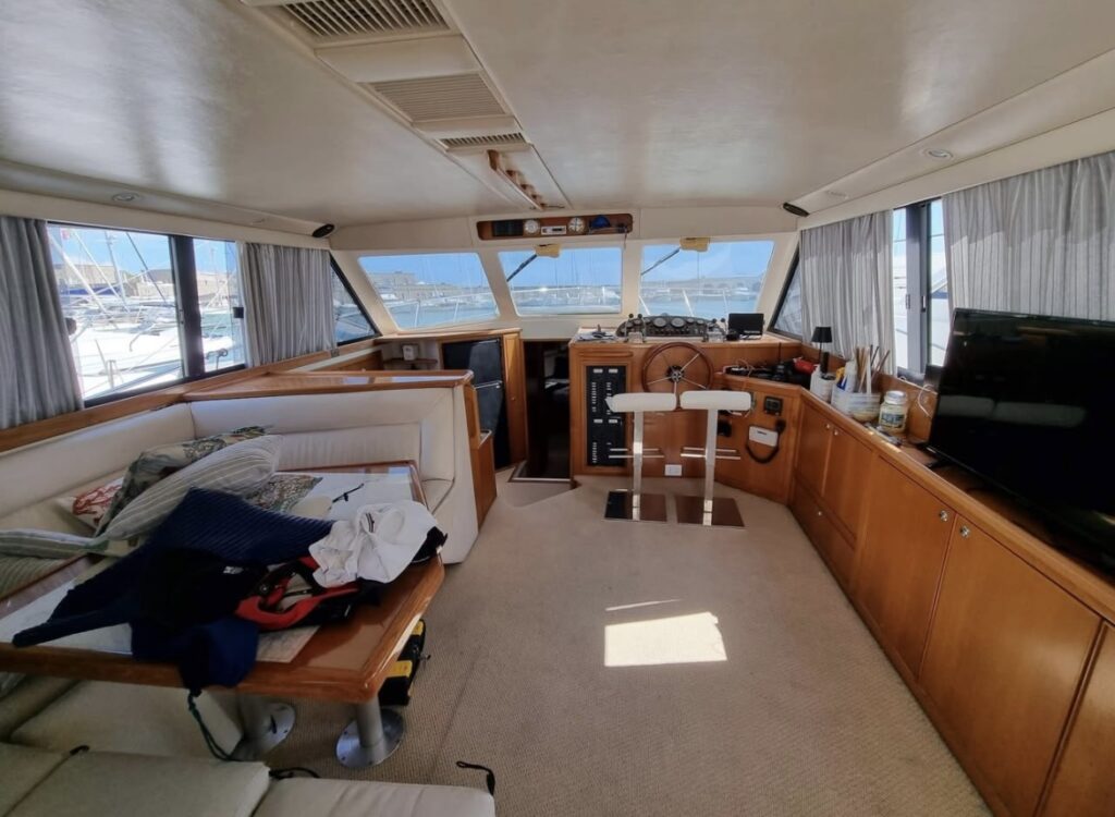 Imbarcazione in ottimo stato generale,Riviera versione 43 Sport Fisherman con Flybridge immatricolata anno 1999,mt.14,70×4,77,motori 2×435 Caterpillar-Dita completamente rifatti nuovi Marzo 2023 zero ore,turbine e iniettori nuovi,2 cabine e dinette trasformabile,cabina armatoriale a prua con letto matrimoniale,locale wc con cabina doccia separata,cabina ospiti con due letti e locale wc con doccia,ulteriore letto matrimoniale nella dinette trasformabile,aria condizionata in tutti gli ambienti,Boiler,Tv,impianto stereo con diffusori audio anche esterni,doppi comandi(interno e fly),Gps Raymarine con plotter cartografico,pilota automatico,gruppo elettrogeno diesel 8 Kw,batterie nuove(settembre 2022),pozzetto in teak,cuscineria esterna nuova,ancora catena in acciaio inox 75 metri,plancetta in Vtr allungata,scaletta in acciaio,passerella Besenzoni elettrica.